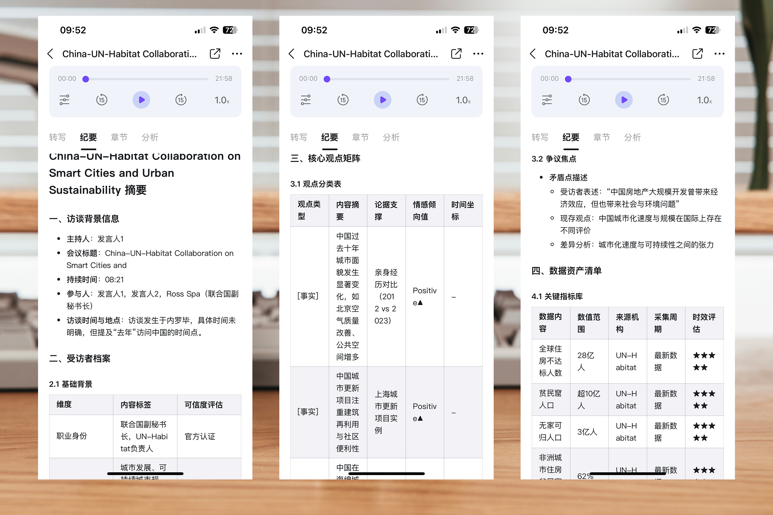 纪要中生成了多个表格,第一个表格描述了事实和观点,对于国内城市发展的经验、城市发展的理念情感倾向值评价均为积极评价,其中一些观点,比如中国经济对全球南方国家具有可复制性,比如城市发展理念与联合国“以人为本”的城市理念高度契合也符合访谈内容。