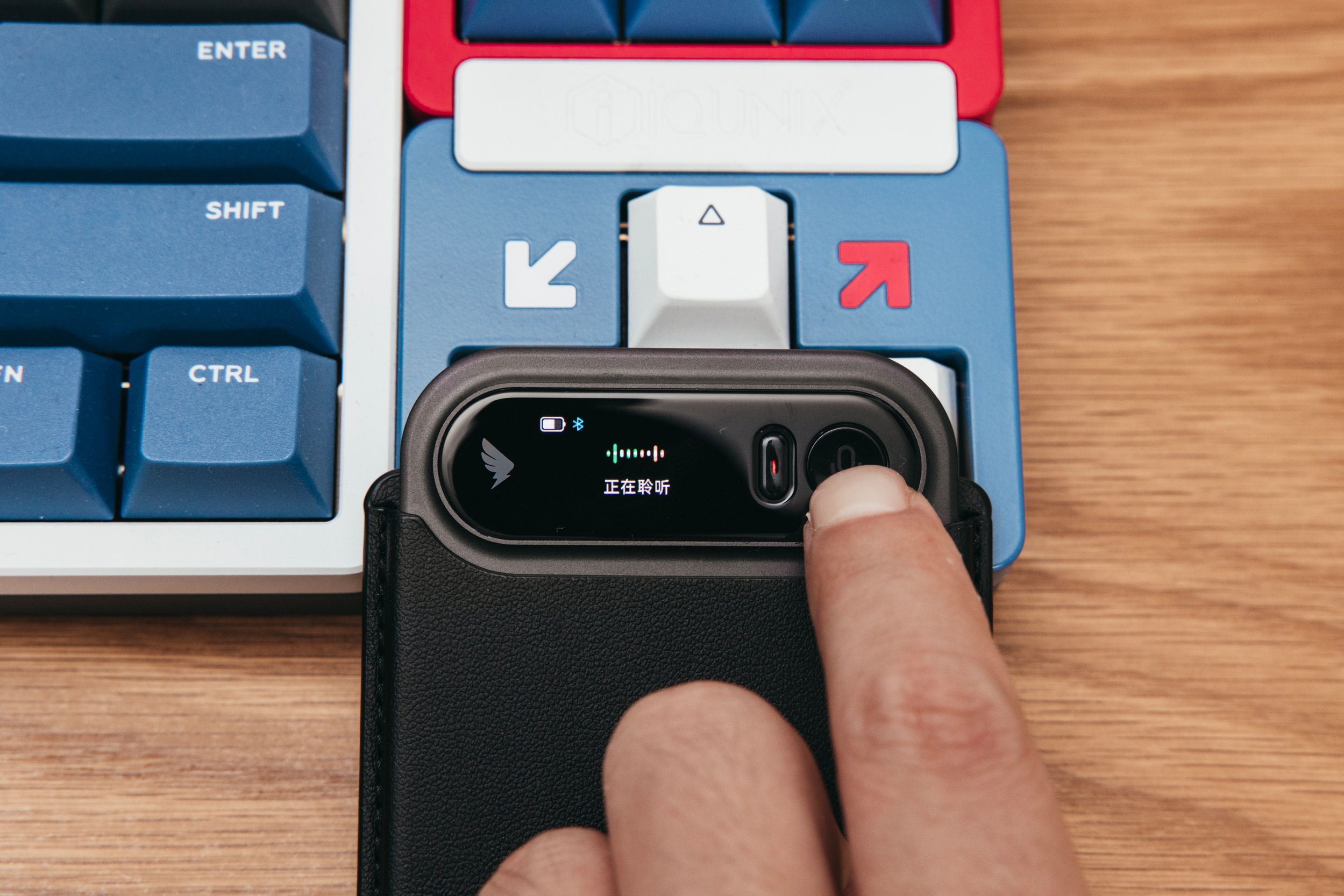 左侧按键主要是负责开关机、录音开始/暂停,右侧语音键除了发送语音,另一个作用是开启屏幕。