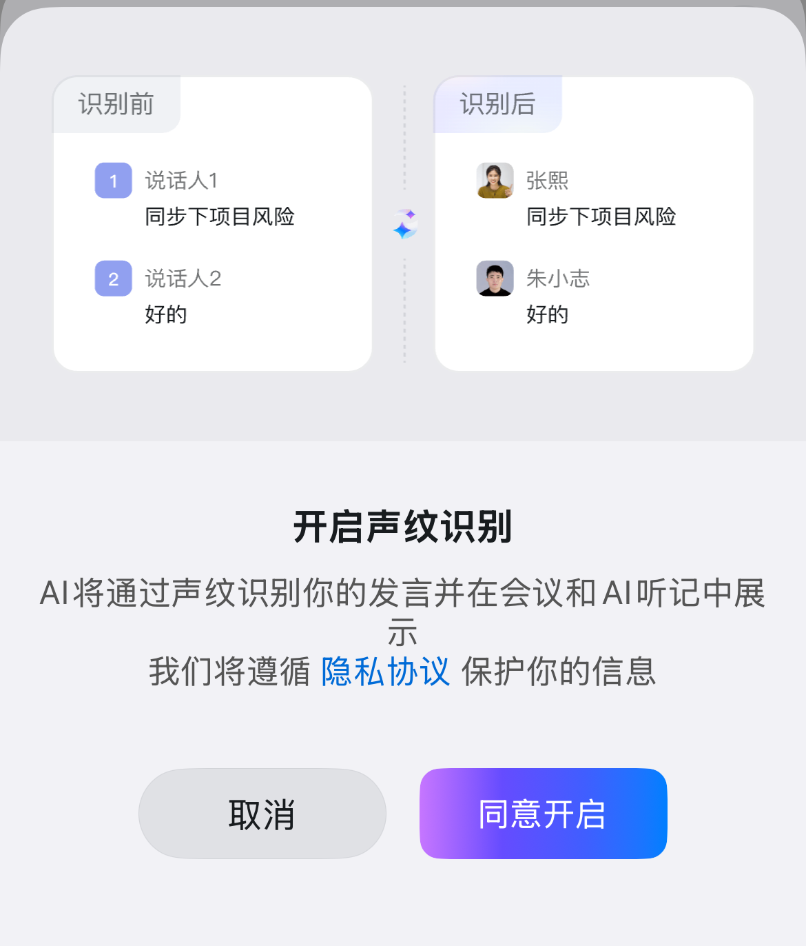 另外会议还可以打开声纹识别功能,对于本人声纹会标识,使用上会更方便。