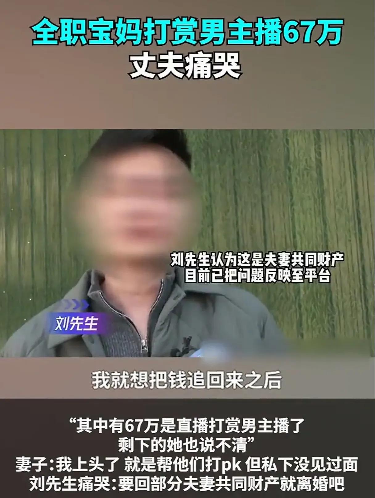 郑州男子刘先生,和妻子结婚8年,挣得116万积蓄都放妻子名下。近日,他想看一眼存款,却发现妻子的手机上只有0.30的余额。刘先生觉得天塌了,再三追问下,妻子支支吾吾说,打赏给男主播67万,自己还欠了8万网贷。刘先生脑袋嗡嗡的,血压瞬间飙升。