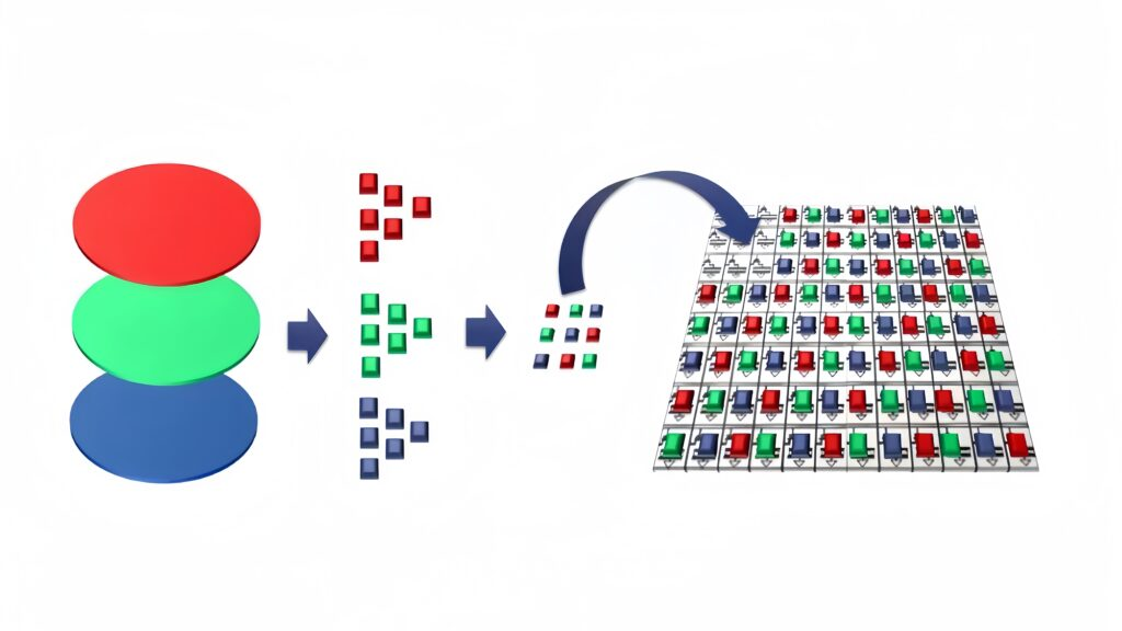 MicroLED显示的调制器,是每个MicroLED灯背后的CMOS驱动。例如Meta眼镜的像素是600×600,用MicroLED就需要有36万个像素发光,CMOS驱动就是在控制哪些灯亮、哪些灯暗。MicroLED屏幕的生产,简单来讲,先是一个灯(MicroLED)一个灯单独生长,然后巨量转移、规整放置在一起。