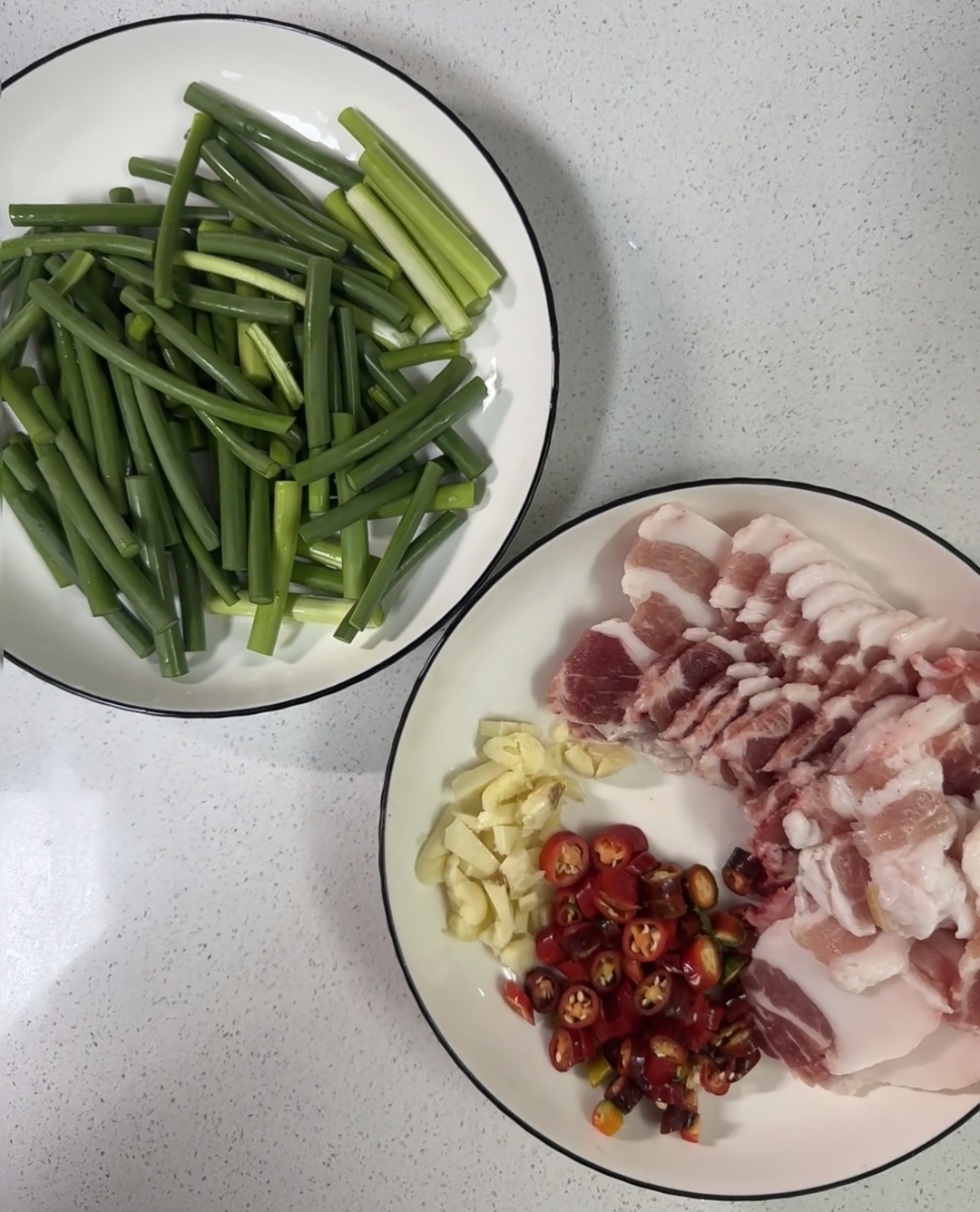 先把五花肉从冰箱里拿出来稍微解冻一下,这样切薄片更容易。蒜苔洗干净后,记得甩掉水珠,不然下锅像炸鞭炮。切5厘米左右的段,太长夹不起来,太短没嚼头。