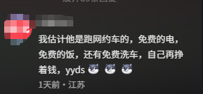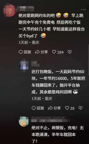 还有网友断言,“这绝对是跑网约车的,早跑完中午充个免费电,然后再吃个饭,一天节约好几十呢。”按照这种操作,简直是无本跑滴滴,搞不好半年就回本。