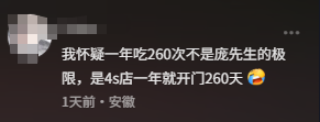 此事一出,网友几乎一边倒为 4S 店喊冤,认为这种“白嫖”太没有底线了,还有网友调侃,“一年吃260次不是庞先生的极限,是4s店一年就开门260天”。