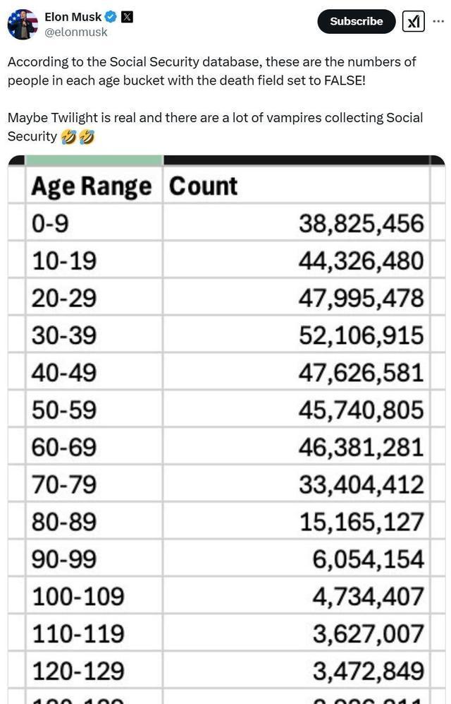 马斯克发现美社保系统漏洞:超3.94亿人领取,含2000万以上百岁老人,甚至有360岁记录,而美总人口仅3.34亿,多出6000万,这些异常数据令人费解。