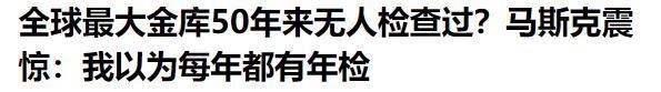 马斯克原本不信此言,认为即便是小金库也会年检,乃至更频繁。全球最大金库不年检之说,在他看来,颇有危言耸听之嫌。
