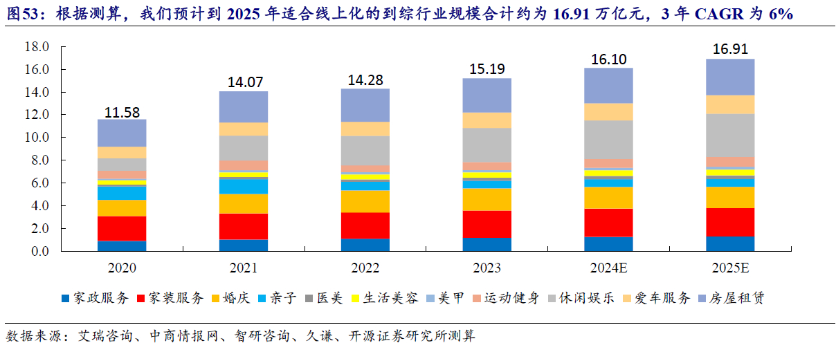 按照开源证券2024年12月一份研报的测算,国内适合线上化的到店综合行业,国内适合线上化的到店综合行业,包括家政、家装、生活美容、美甲、休闲娱乐等,2023年市场规模约为15.2万亿元,线上化率仅2.1%,预计2025年将达16.9万亿元,这些行业有望借助互联网平台流量“重做一遍”。