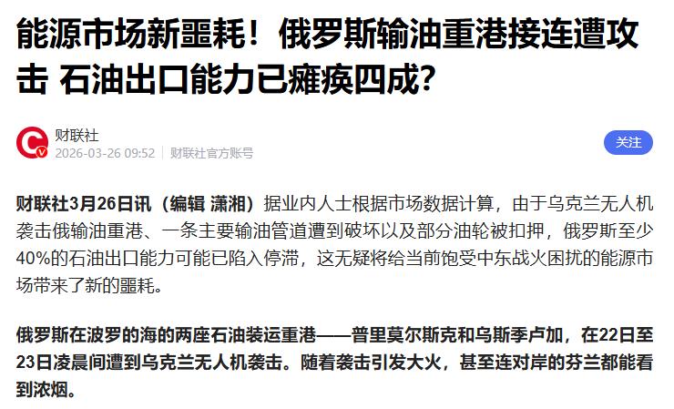 4.《Fire at Russia's Ust-Luga Oil Port on Baltic After Drone Attack》——彭博社(Bloomberg),2026年3月25日