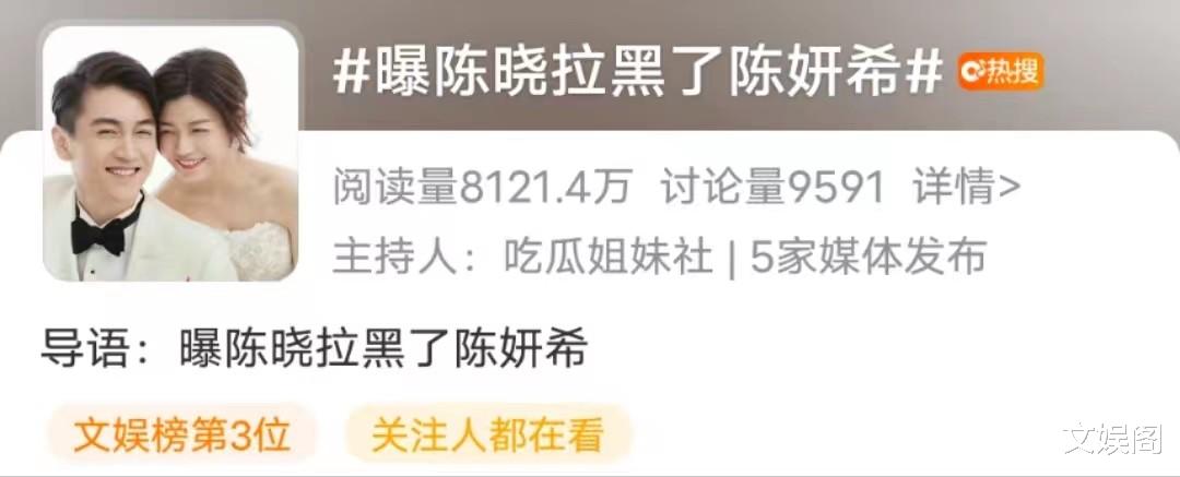 娱乐圈又出了一个劲爆的瓜,即#陈晓拉黑了陈妍希。小编在刚刚的热搜词条中发现有五条是和陈晓夫妻相关的,而且都是与感情破裂有关的话题。