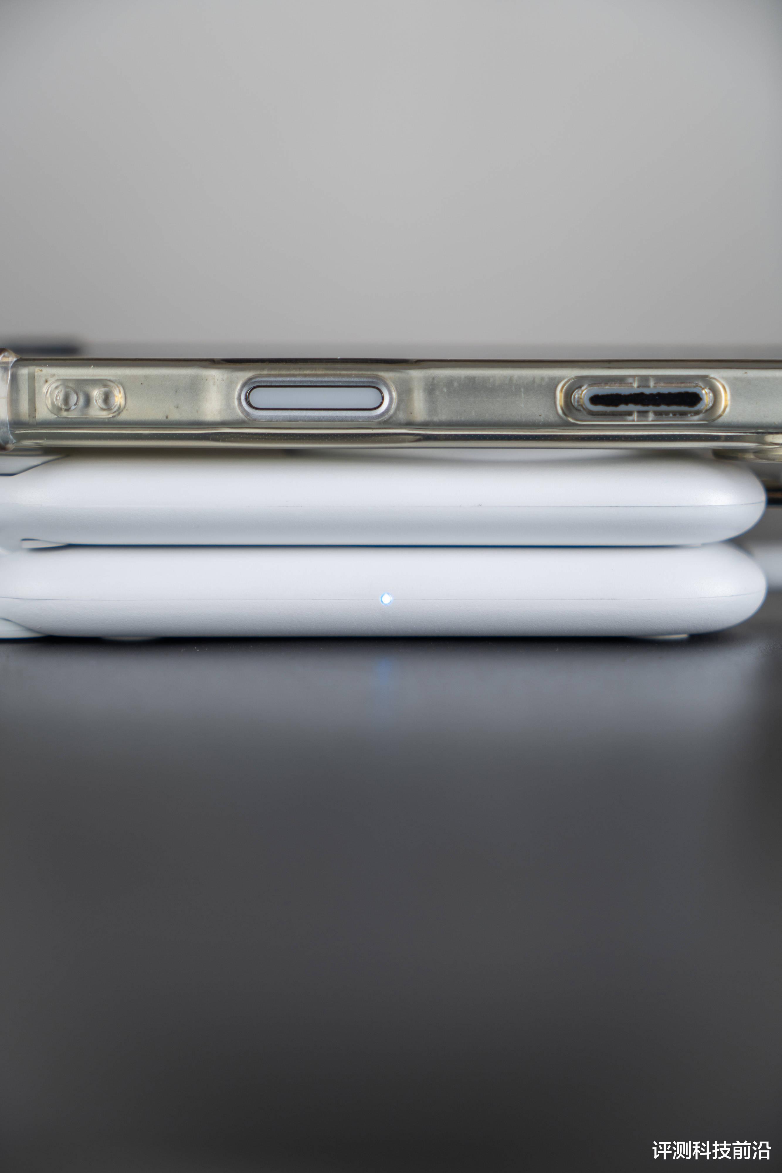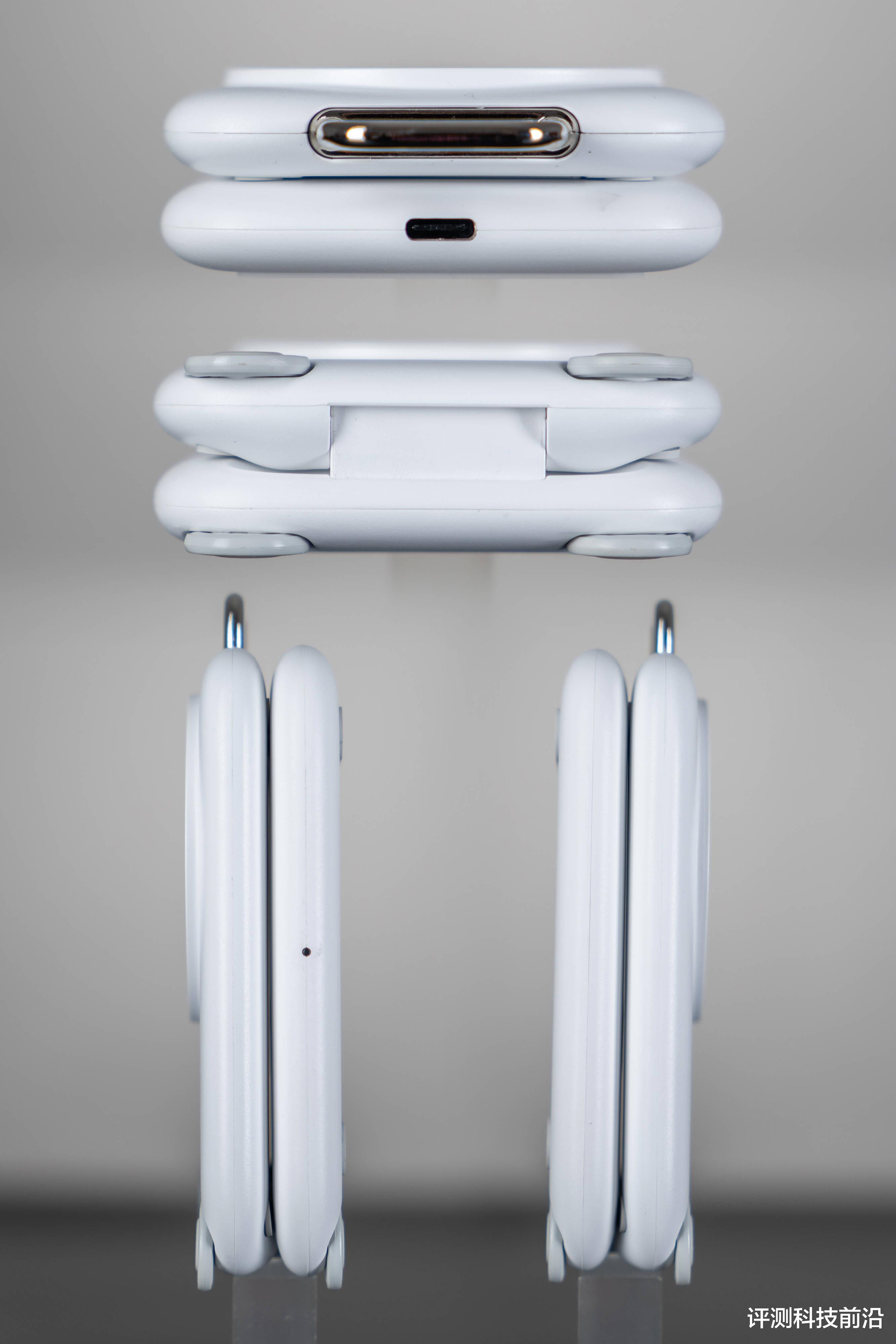 ▼背面上下各有一条硅胶防滑垫,侧面看到它分为了上下两层,可以折叠在一起,下层顶部有个C口的输入接口,侧面有个状态指示灯