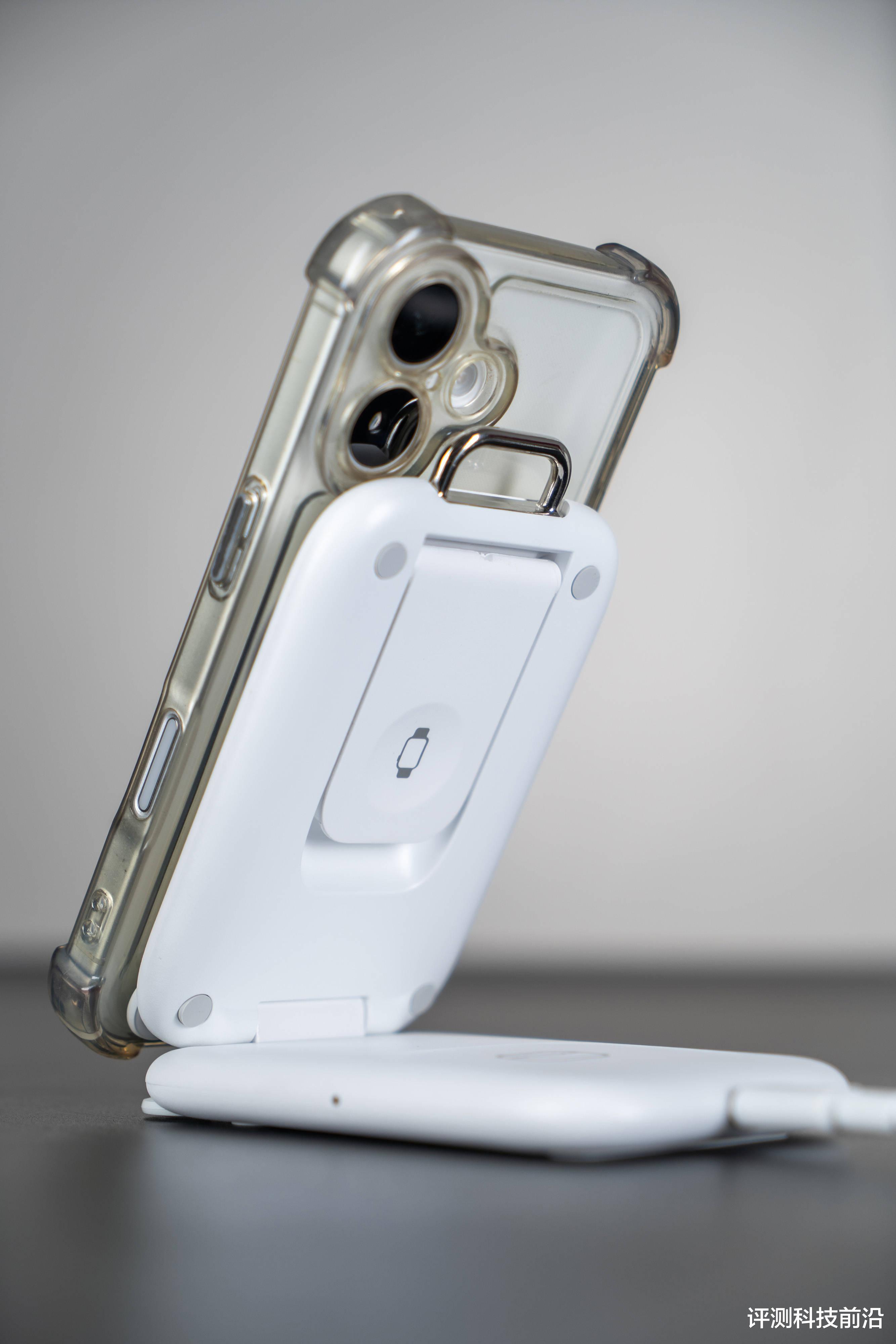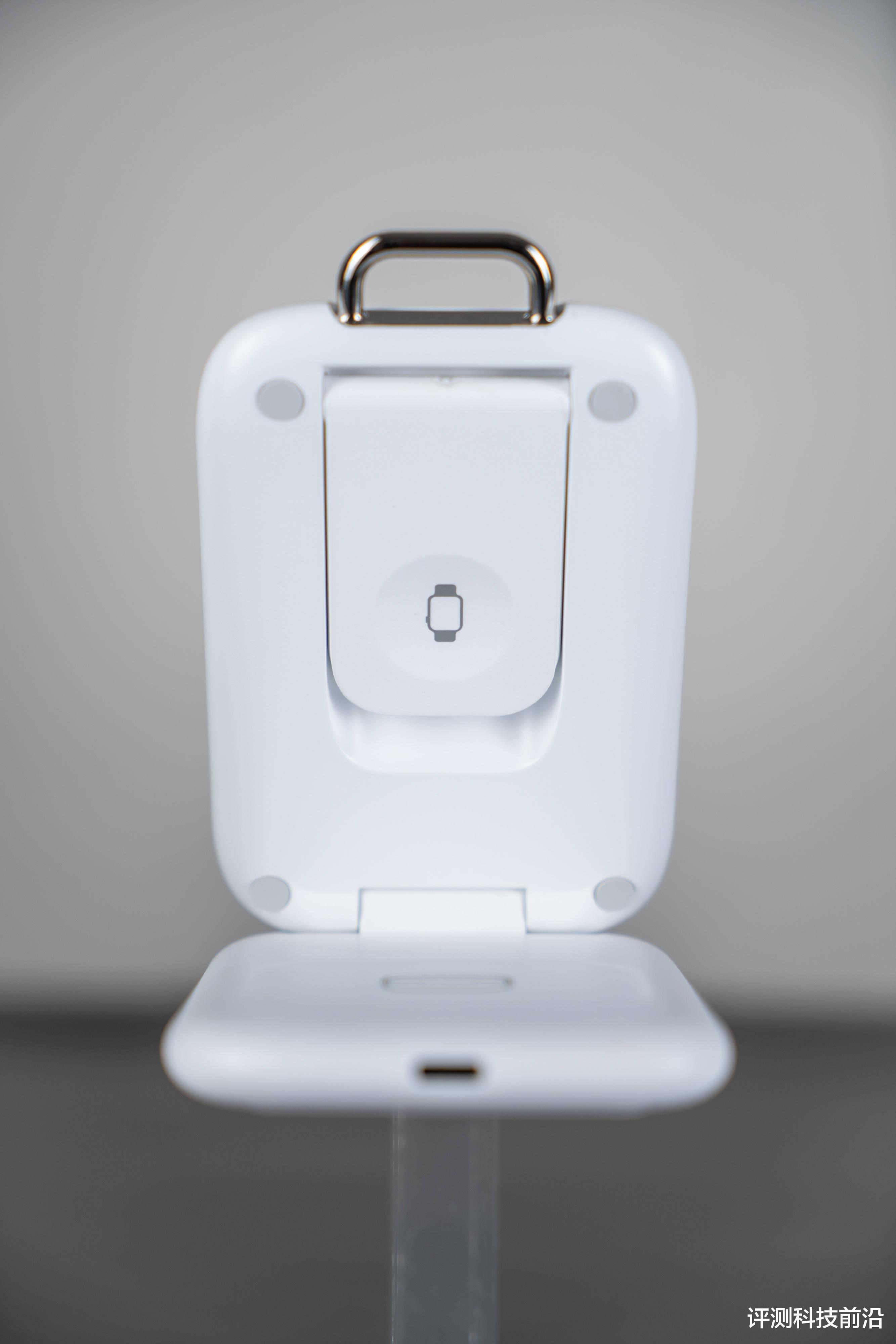 ▼上下两层展开后,上层背面四个角落各有一个硅胶垫,还可以看到有个手表充电平台收纳在中间,下层是耳机的无线充电平台