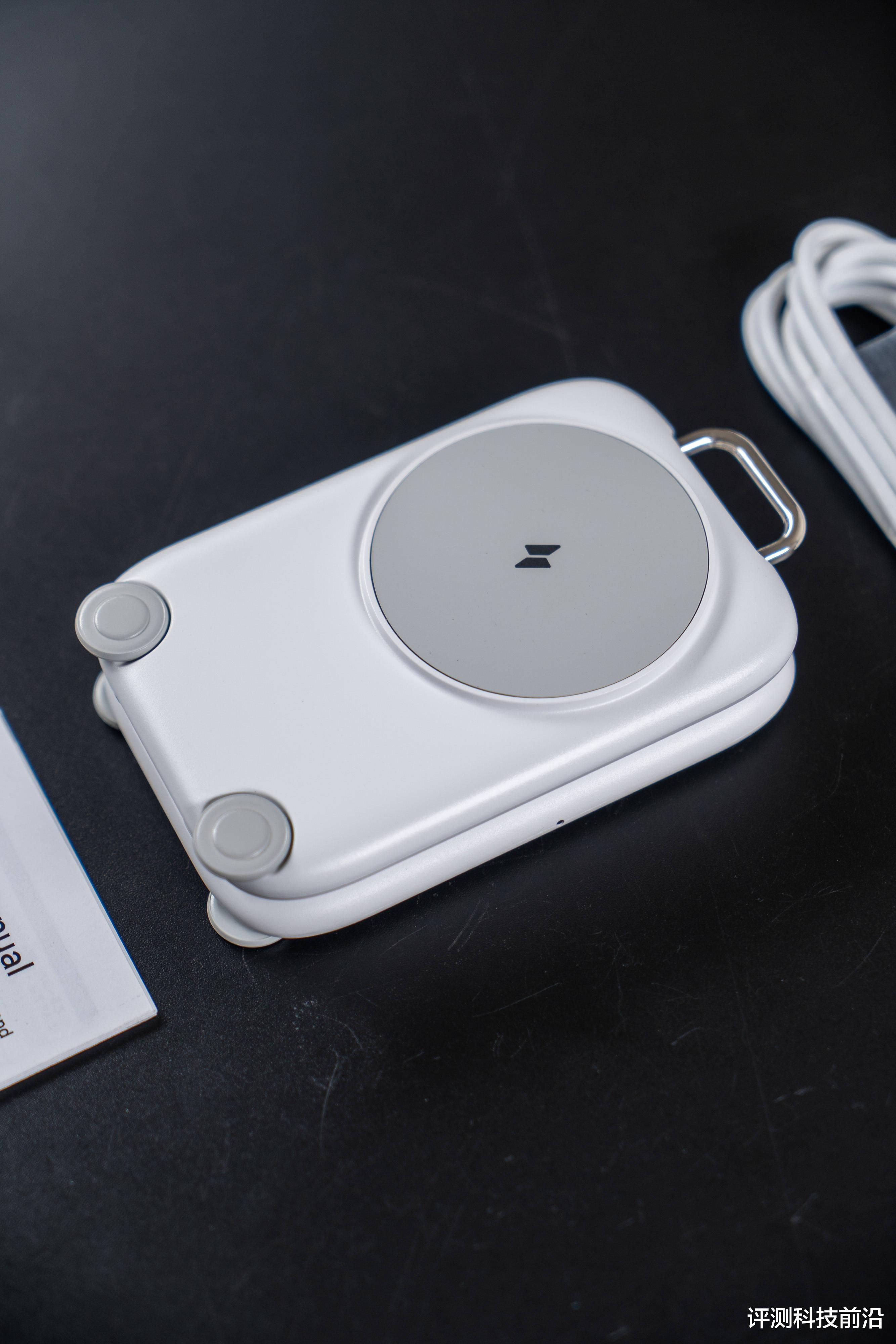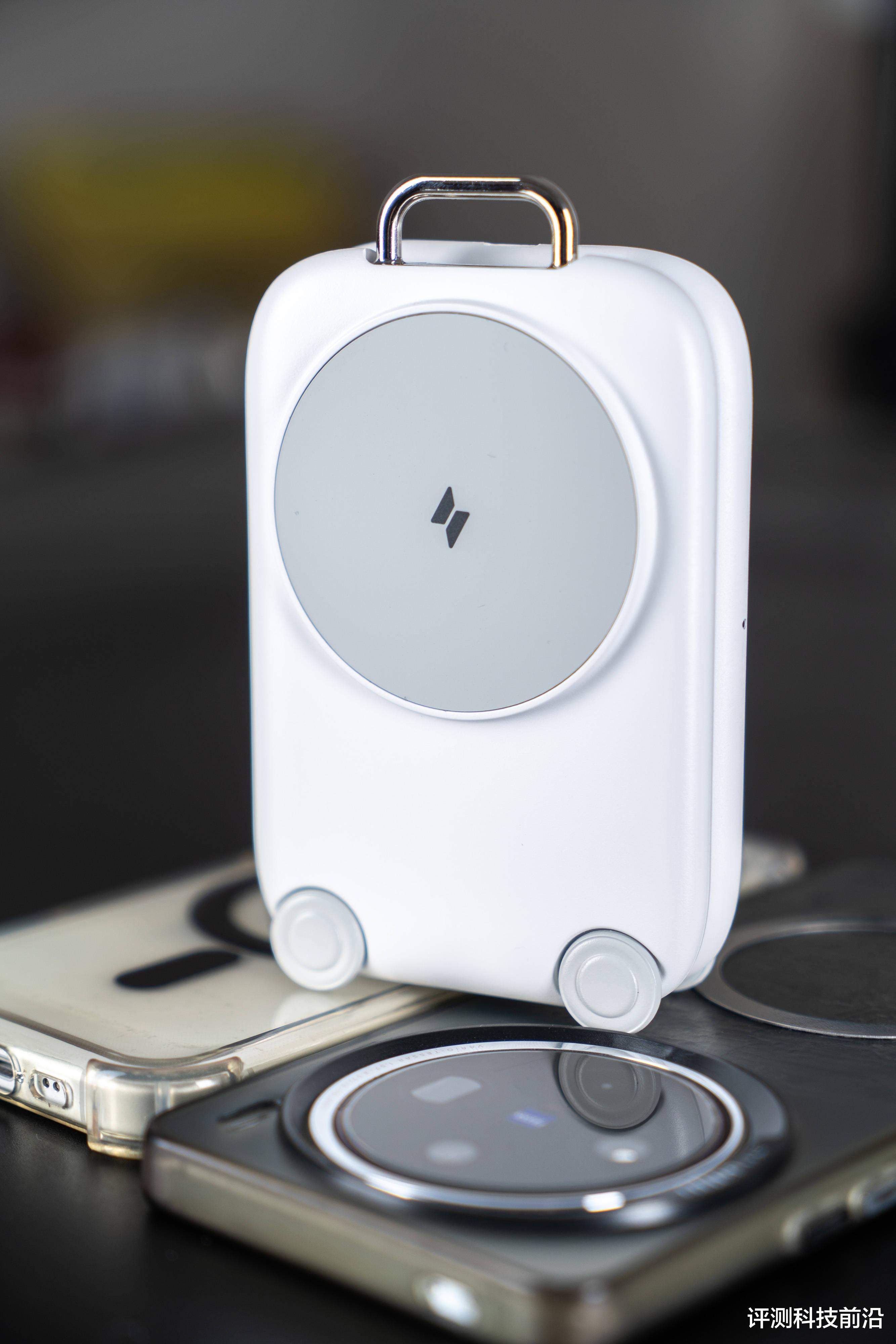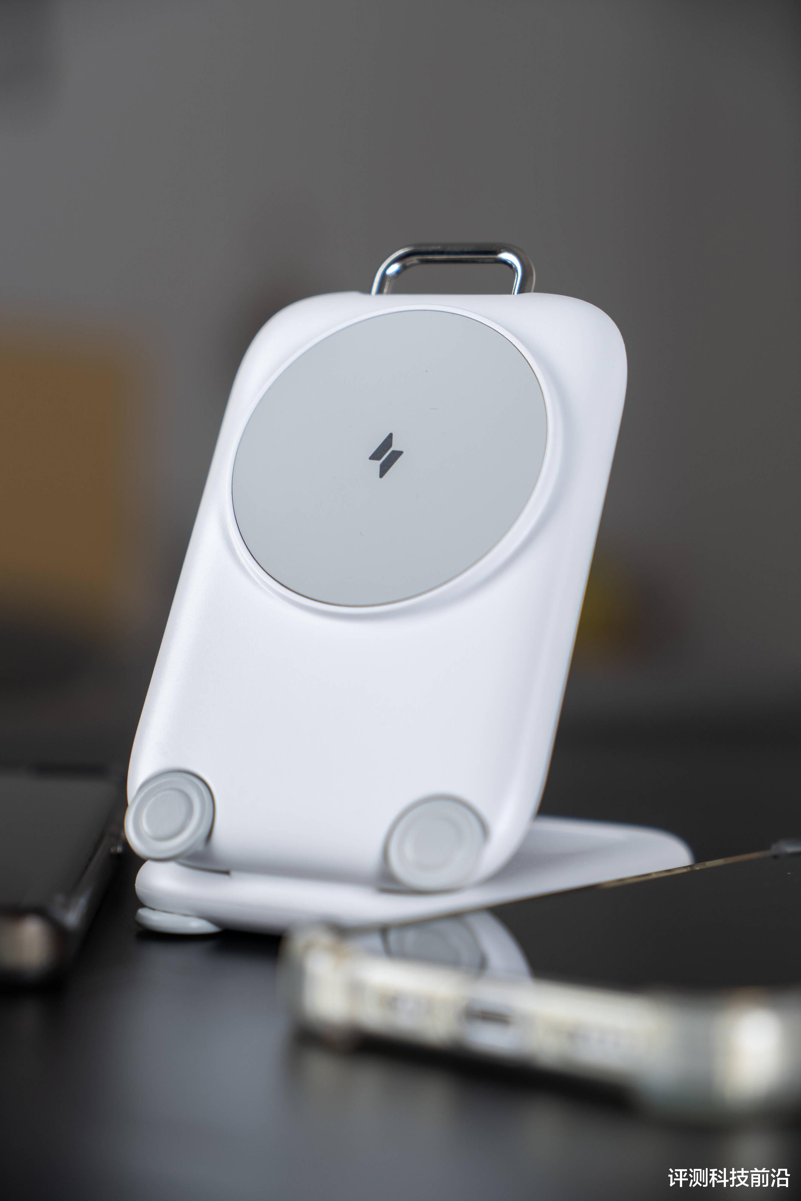 ▼正面就可以看出来它整体非常圆润,都是弧线倒角;最顶上有个把手一样的结构,不仅是个装饰,也能把它挂在带挂钩的地方进行收纳;上方最大的圆形区域就是手机无线充电区域,下方是轮子的造型,可惜不能转动,要是能转动就好玩了
