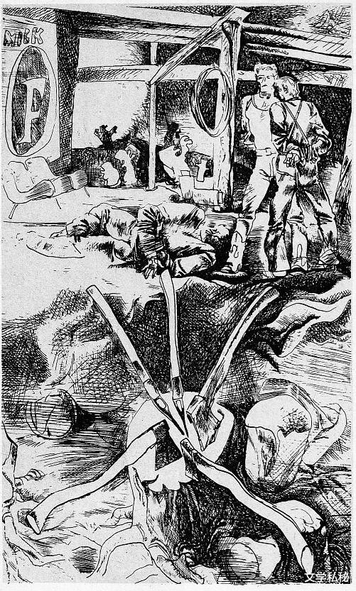 克里姆·李的插图,从早期作品,就带有较为明显的写意、变形倾向,但是从他的线条的勾勒力道来看,他的写实功能还是相当的强大的。画家为《这里的黎明静悄悄》配置的插图,带有非常强烈的写意功能,在水彩的添砖加瓦的作用下,整个画面还是显出了一种强化女性柔性色彩的意图,而超短裙的运用,无疑更加突出了女兵的女性特质,这也是这一版插图的与众不同的一面,不能说画家是出于迎合市场的需要,才作出如此的设计。
