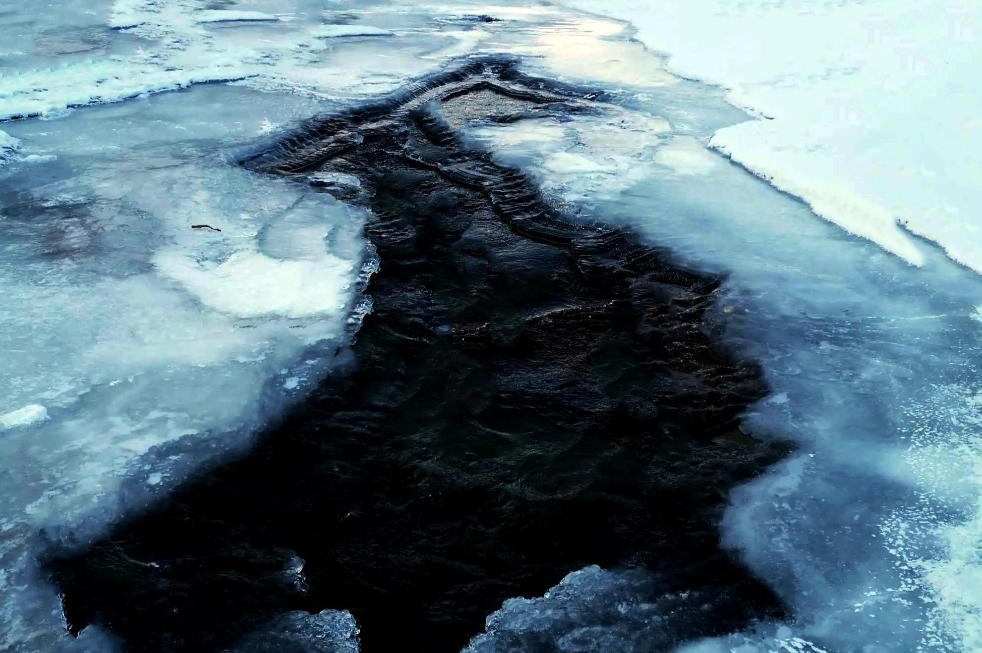四人借着月光,在山间行走了大半夜,来到一片冰河之上,为了在冰上找水,无意间发现了冰下的水已流走,而在河底形成一些冰窟窿,眼看天空也露出鱼肚白,想到马匪军今日很有可能便要搜山,于是四人当即决定躲入冰洞之中躲避搜查。