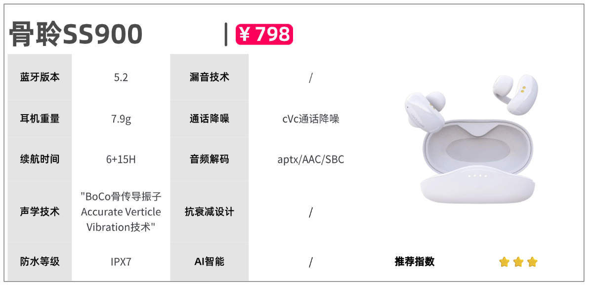 弹性夹持技术,亲肤纳米涂层,力求在保证佩戴牢靠的同时提供舒适的触感。单耳7.9克的重量,佩戴感不是很重,日常通勤、运动长时间佩戴也是没什么问题的。骨聆SS900是一款定位独特的真无线骨传导耳机,音质方面纯骨导听体验,但不适合追求极致音质,尤其是对低频下潜和声场有高要求的音乐发烧友。主要使用场景在地铁、机场等极端嘈杂环境的用户,外界噪音会严重干扰听音体验。