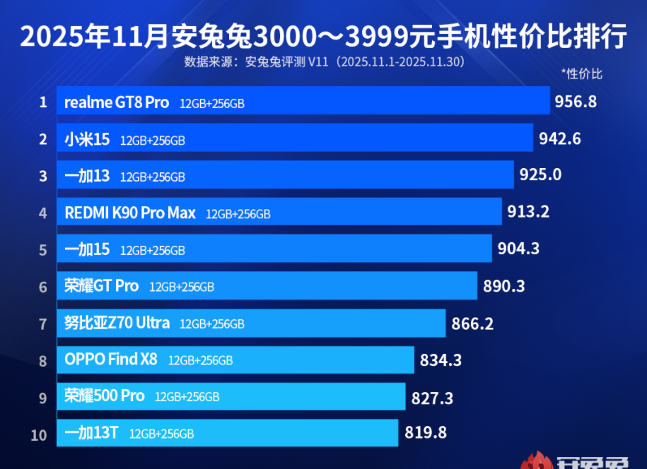 进入到12月份后,安兔兔也是公布了上个月各个价位段的性价比排行榜,其中在3000到3999价位排行榜中,真我GT8Pro轻松击败了红米K90ProMax和一加15,拿下了性价比榜单第1名。