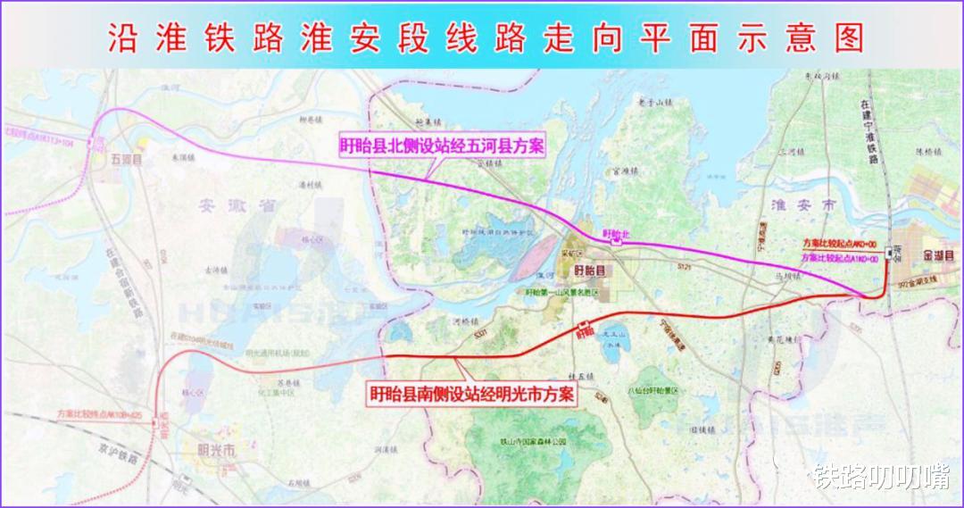 这些年沿线省份都在积极争取纳入正在修编的《中长期铁路网规划》等文件,目前江苏段已进行规划方案研究。根据研究,沿淮铁路新建正线全长307公里,线路初步规划东起盐城站,向西经建湖县、宝应县后引入在建宁淮铁路金湖站,继续向西延伸至盱眙县、泗洪县并接入在建合肥至新沂铁路五河站,最终引入蚌埠南站新建车场。并且根据盱眙县的答复,国家铁路集团鉴定中心已同意在金湖站为沿淮铁路预留接口。