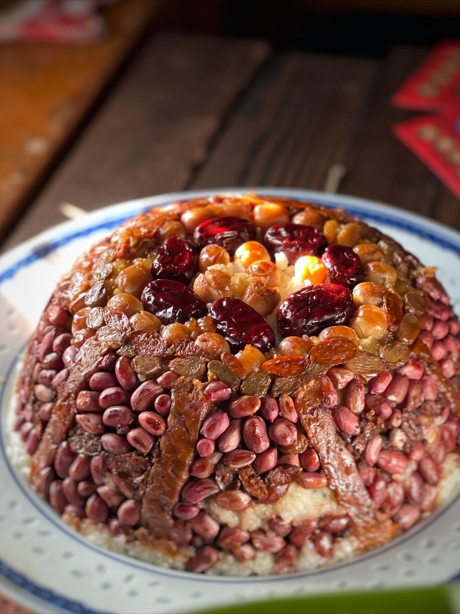猪油拌饭增香,豆沙需慢熬百分钟,配红枣、莲子、桂圆等“八宝”,寓意团圆吉祥。