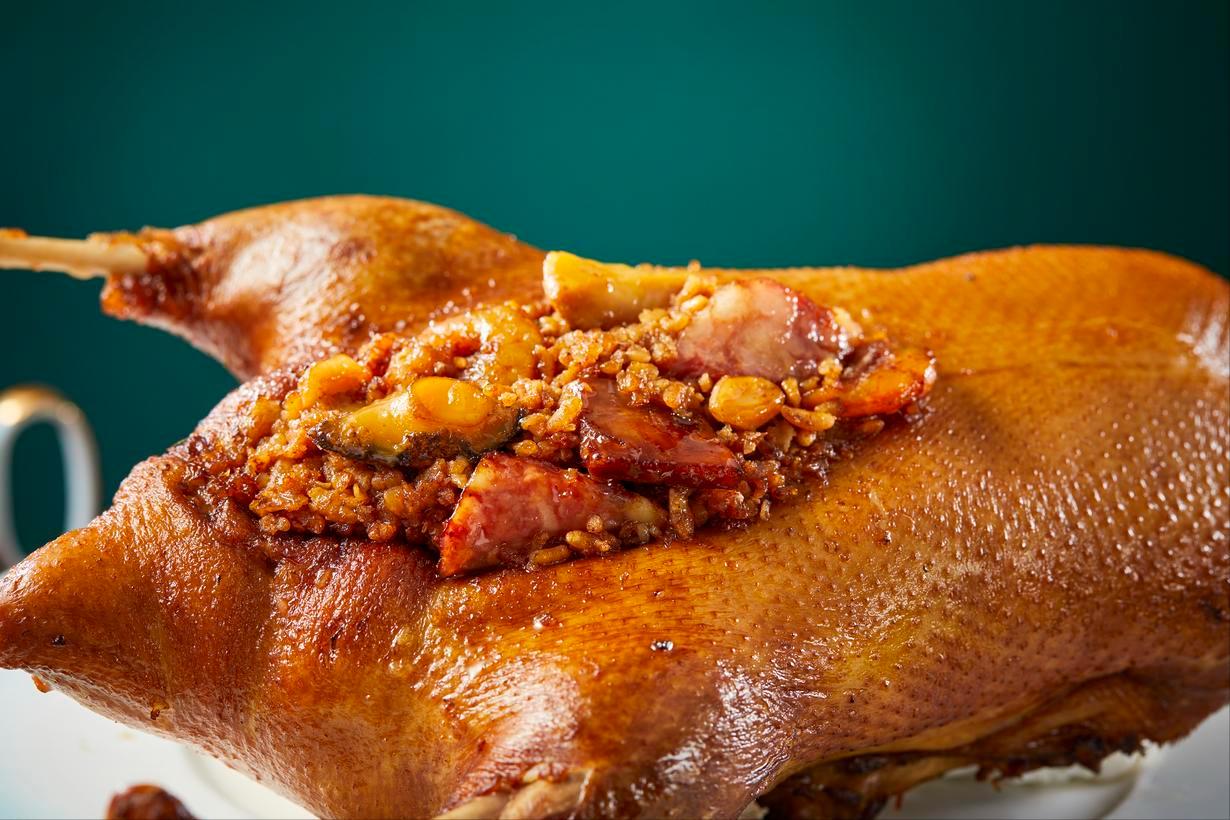 形态丰腴饱满如金裹玉,鸭皮油亮,糯米、火腿、干贝等八宝馅料软糯鲜香,