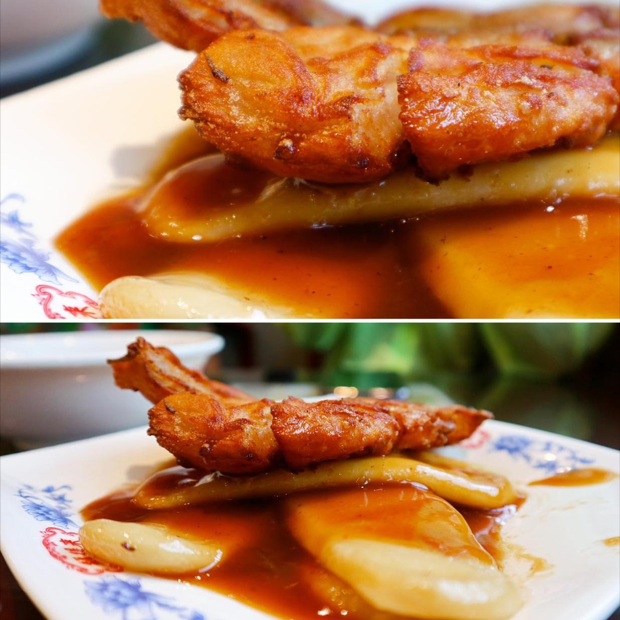 后改良为炸制,排骨裹蛋粉浆炸至金黄酥脆,年糕切薄片煎软糯,