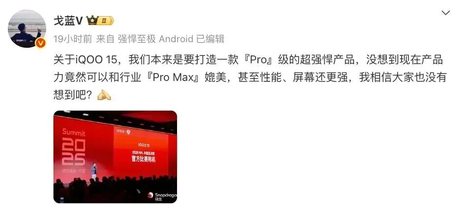 据悉,iQOO 产品经理 @戈蓝V 在预热中提到:“关于iQOO 15,我们本来是要打造一款『Pro』级的超强悍产品,没想到现在产品力竟然可以和行业『Pro Max』媲美,甚至性能、屏幕还更强,我相信大家也没有想到吧?”