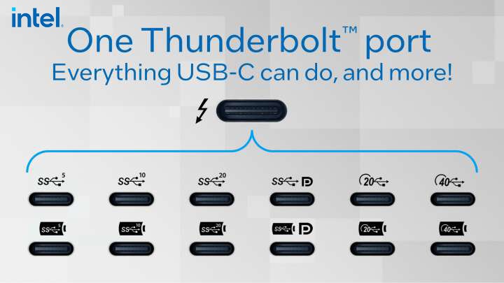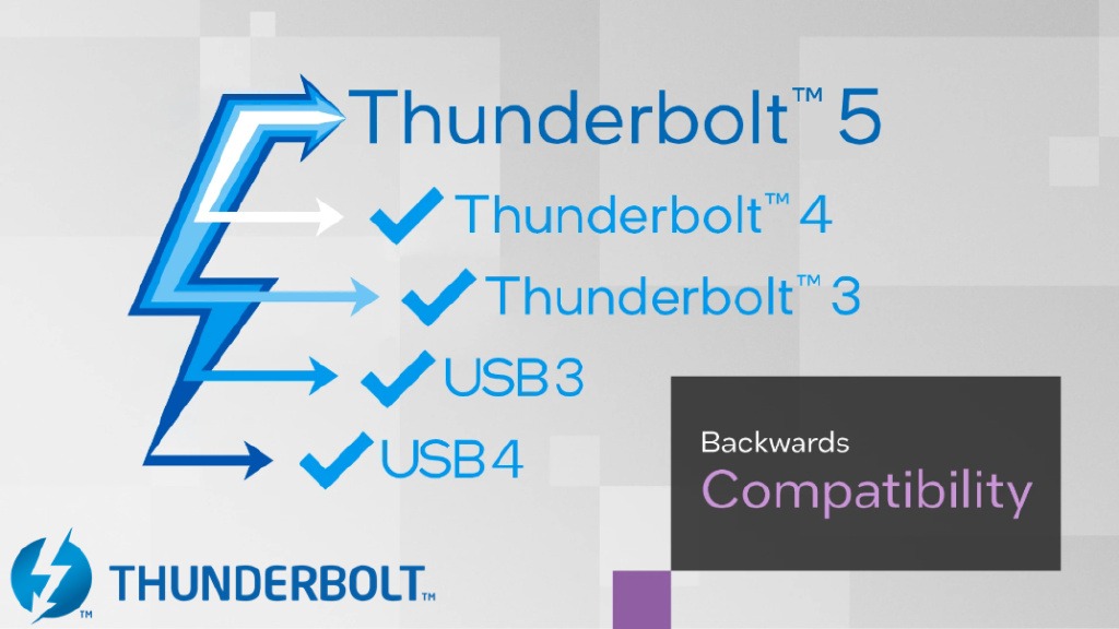 在如今Type-C接口“大一统”的时代,Intel®Thunderbolt™ 5(雷电5)同样也采用了Type-C接口设计,而得益于Intel®Thunderbolt™(英特尔雷电技术)强大的向下兼容能力,可以这样说,只需要一根Intel®Thunderbolt™ 5(雷电5)数据线,就可以基本包圆你所有搭载了Type-C充电接口的电子设备。