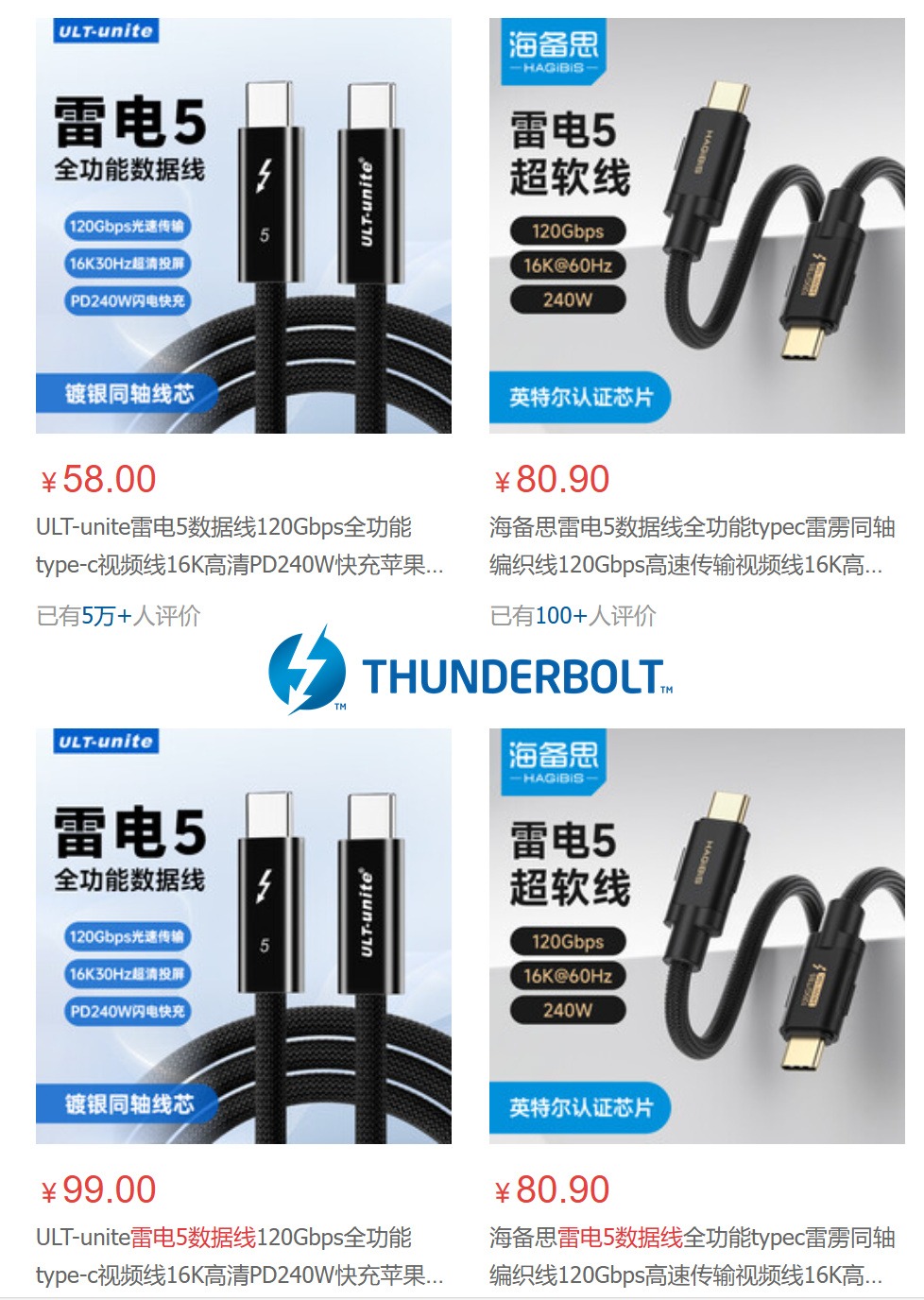 还真没有。当前,Intel®Thunderbolt™ 5(雷电5)数据线的价格在电商平台上已经普遍低于一百元,比不少手机品牌的原厂USB2.0快充数据线还要更便宜。