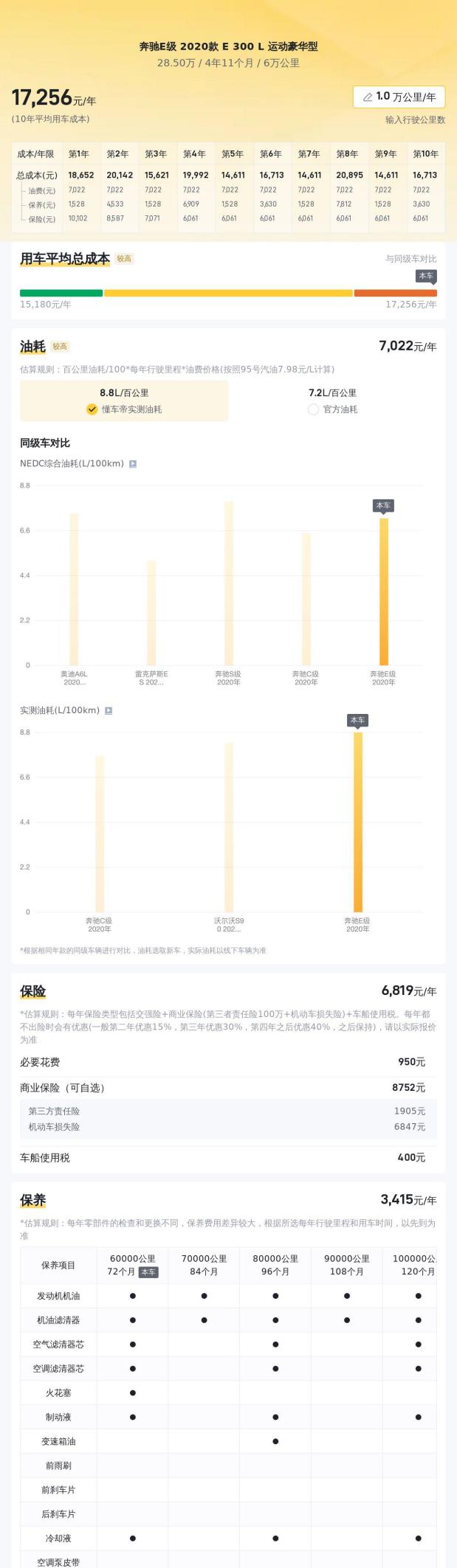 此外,我们还需要考虑后期的用车成本。根据估算,这辆奔驰E级的年均用车成本约为1.7万元,略高于同级别车型的平均水平。这主要是因为奔驰的保养费用相对较高。