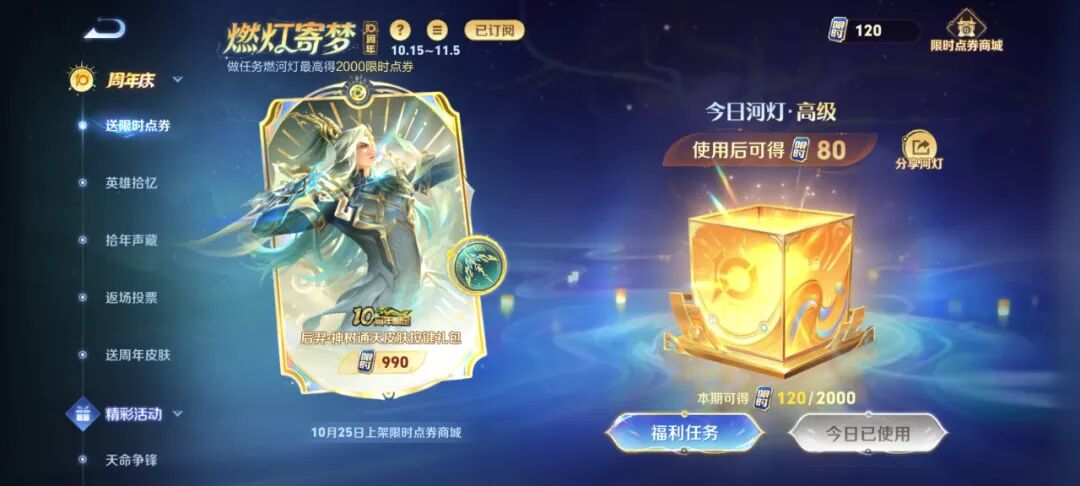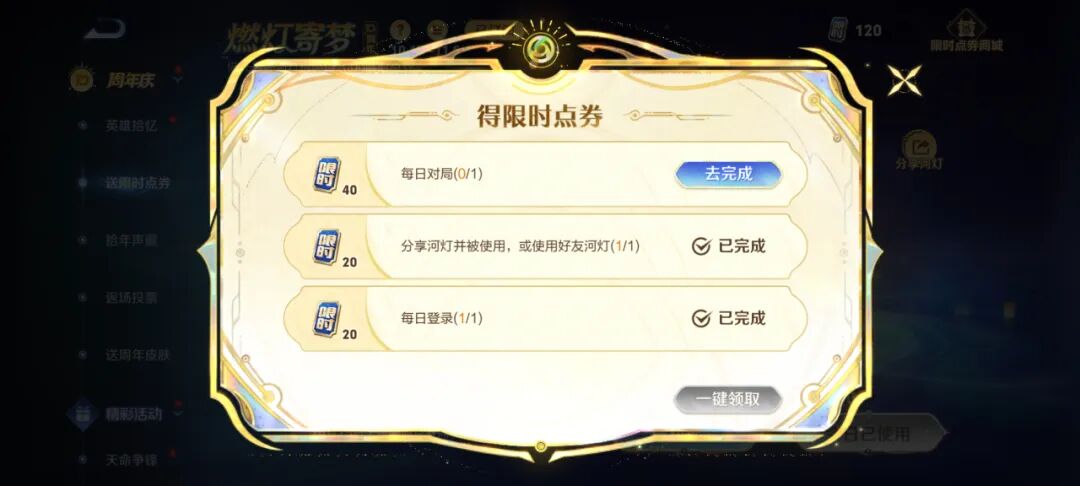 而每天的任务,可以获得80限时点券。这边的分享任务,只需要使用别人的河灯,或者自己的河灯被别人使用就能完成,所以并不需要把你普通或者中级的河灯分享给别人。从这样的情况来看,每天至多可以拿到160限时点券,最少是120限时点券。也就是说,快的话(运气好,每天开的都是高级河灯),仅需13天就能拿到全部的2000限时点券。但想必没人会有这么好的运气,所以时间上肯定还会有所增加。但持续时间总共是22天,自己把握好。