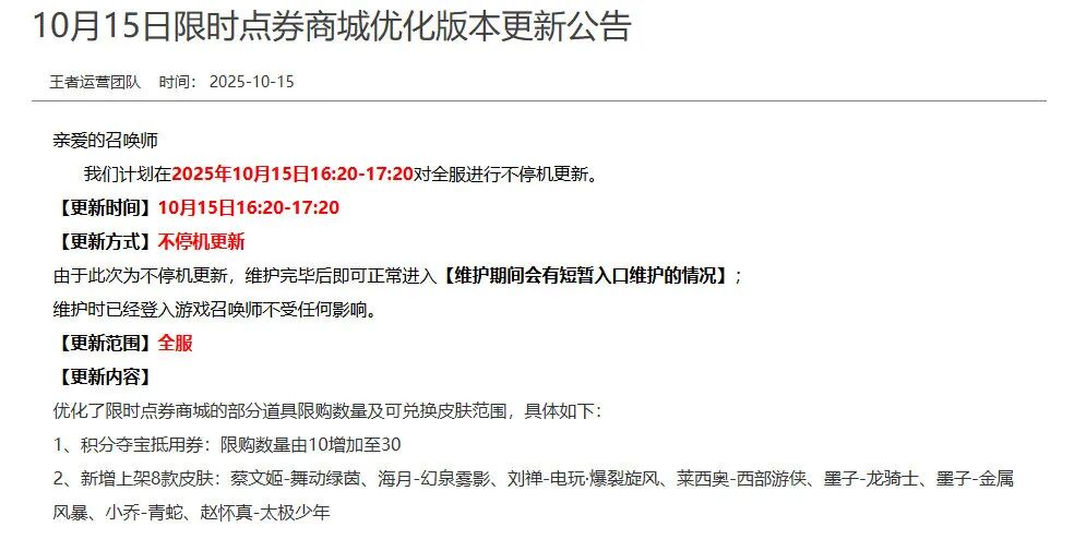 后来紧急更新,积分夺宝券的兑换上限增加至30个。且新增了8款皮肤加入到限时点券商城中。