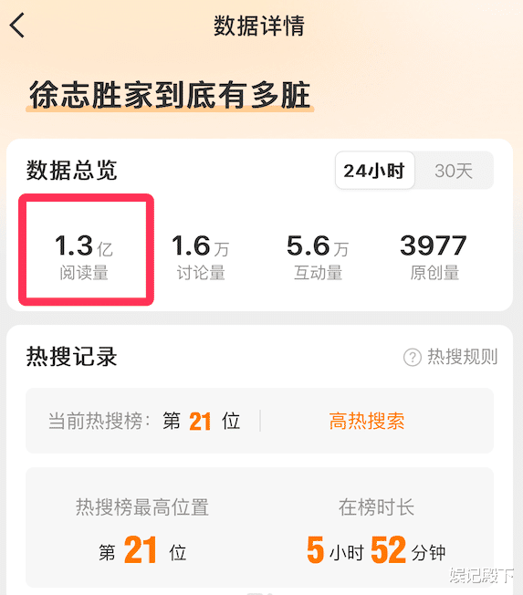 没多久后,这条内容就被飚到了热搜第一名,阅读量已经上百万,截至目前为止,短短几个小时过去了,这条内容的热度仍旧居高不下,虽然在所有领域榜单里占21名,但仍旧是娱乐榜的第一,且阅读量飙升到了1.3亿。
