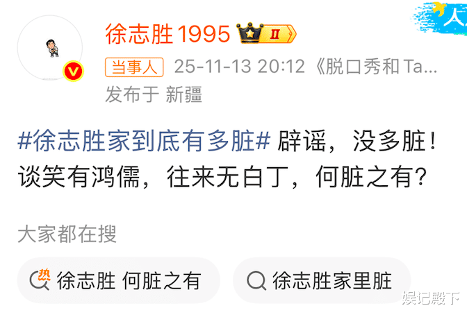 其实不怪徐志胜如此生气,因为这条被1.3亿人阅读的词条名字太难听了,即:#徐志胜家里到底有多脏#