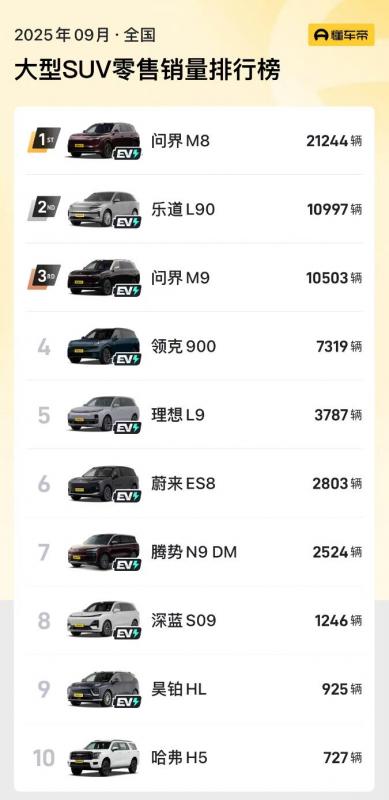 目前,该市场的霸主是问界M9/M8,以及蔚来旗下的乐道L90。其中,问界两款车型都同时提供纯电和增程版本,乐道L90只有纯电版本。此前领跑该细分市场的理想L9在众多对手的围攻下已经从王座上跌落,9月份的销量仅为3787辆,排名第五。