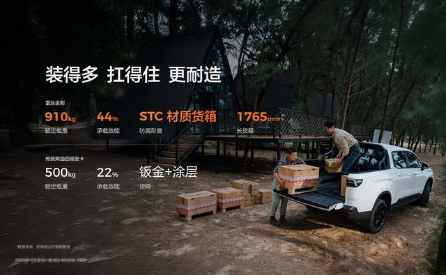 雷达金刚的后斗,突破了传统货箱的用材方式,采用与福特猛禽、特斯拉Cybertruck同类型的 STC耐磨防腐货箱,耐用耐腐,永不生锈。适用于更多作业环境。