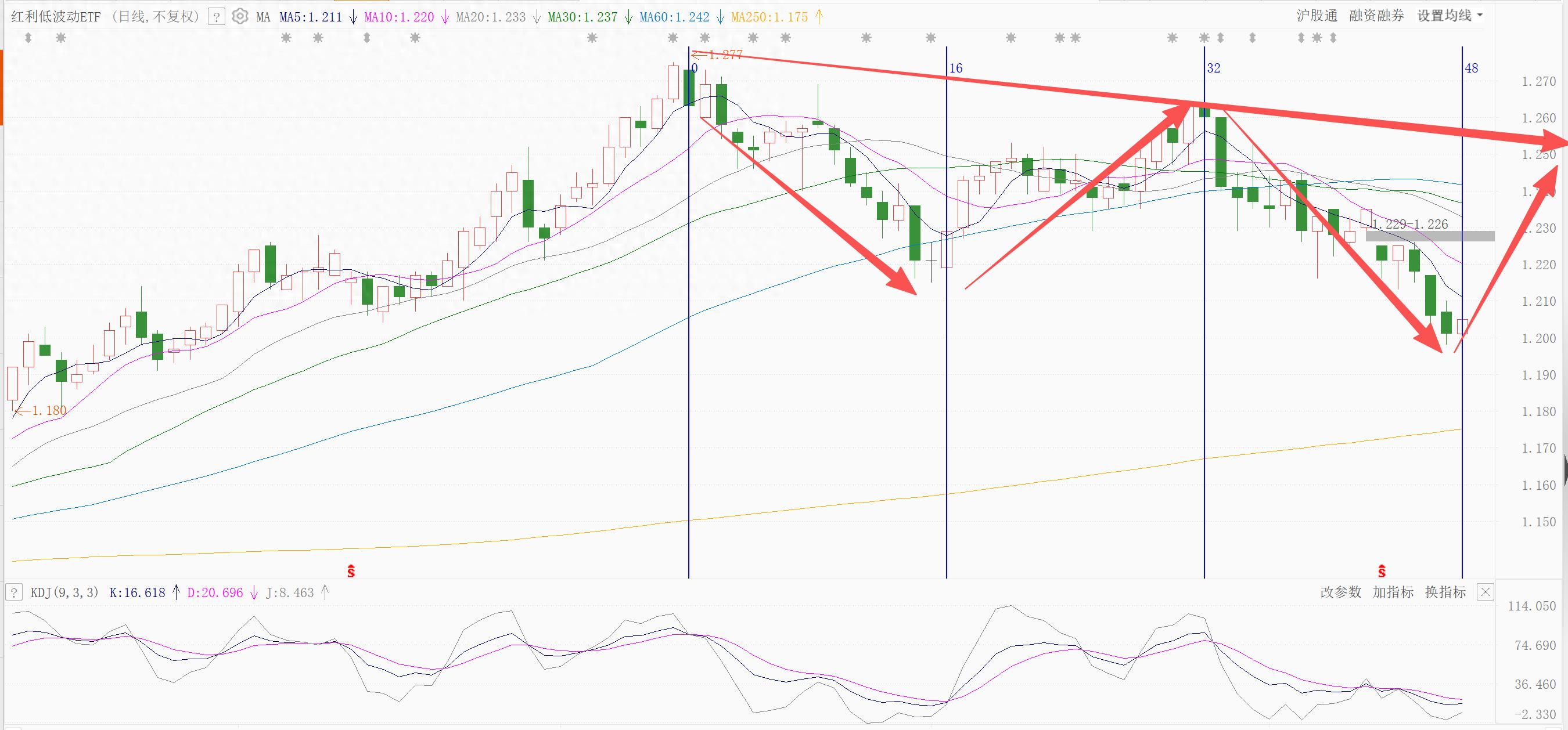 红利低波ETF:从调整周期来看,16天左右的调整周期是非常明显的。基本上节奏也是一波下跌一波反弹这种走法,唯一不好的是第一波下跌和第二波下跌没有形成力度的缩减,反而加大了力度,这就能表明这个位置即使止跌,走出一波反弹,后面还会有下跌,直到形成力度的衰减,走出衰竭结构才能真正的止跌。
