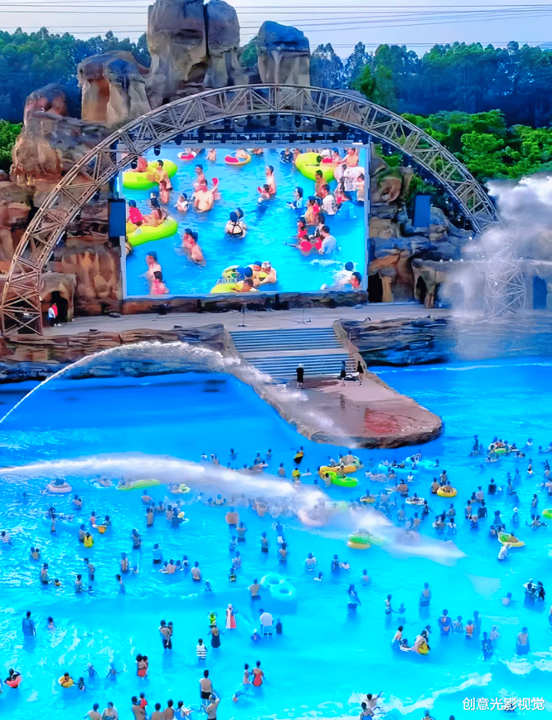 仿生岩壁上的人工瀑布正在演绎水的三重变奏:顶端是珍珠帘幕般的细腻水雾,中层形成叮咚作响的银链,底部则爆发出雪浪翻涌的激情。当电子混音与自然水声在某个魔法时刻共振,喷泉矩阵突然启动,成千上万颗钻石般的水粒子在空中凝结成光的立方体,将整个空间变成沉浸式光影水幕剧场。那些漂浮在透明浮圈上的游客,此刻都成了漂浮在银河系里的星云,彩色泳衣化作斑斓星群,在蓝调背景里流转生辉。
