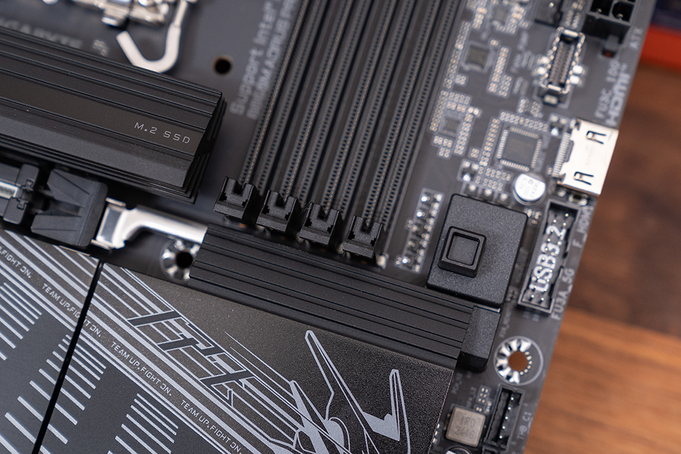 第一条主插槽为超耐久显卡插槽设计,加入橡胶内衬条,保护显卡PCB免受潜在的划伤风险。显卡还支持易拆装设计,在主板边缘处提供PCI-E EZ-Latch Plus 快拆按钮,轻轻一按即可快速取下显卡,安装和拆卸极为方便。
