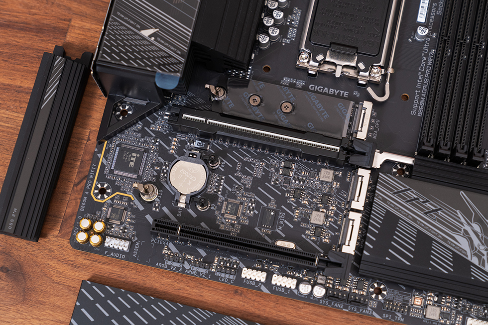 技嘉B860M电竞雕主板提供了3个M.2槽位,最上面的M.2_1槽由CPU直连通道提供,PCIe 5.0 x4规格。并配备独有的免工具快拆散热装甲,M.2_2、3的两个槽位均为PCIe 4.0 x4规格,一个由CPU直连,和一个由B860芯片组提供 2个槽位共用1个超大的散热装甲。除了M.2槽位外,还提供了4个SATA 3.0接口,满足丰富的存储需求 。