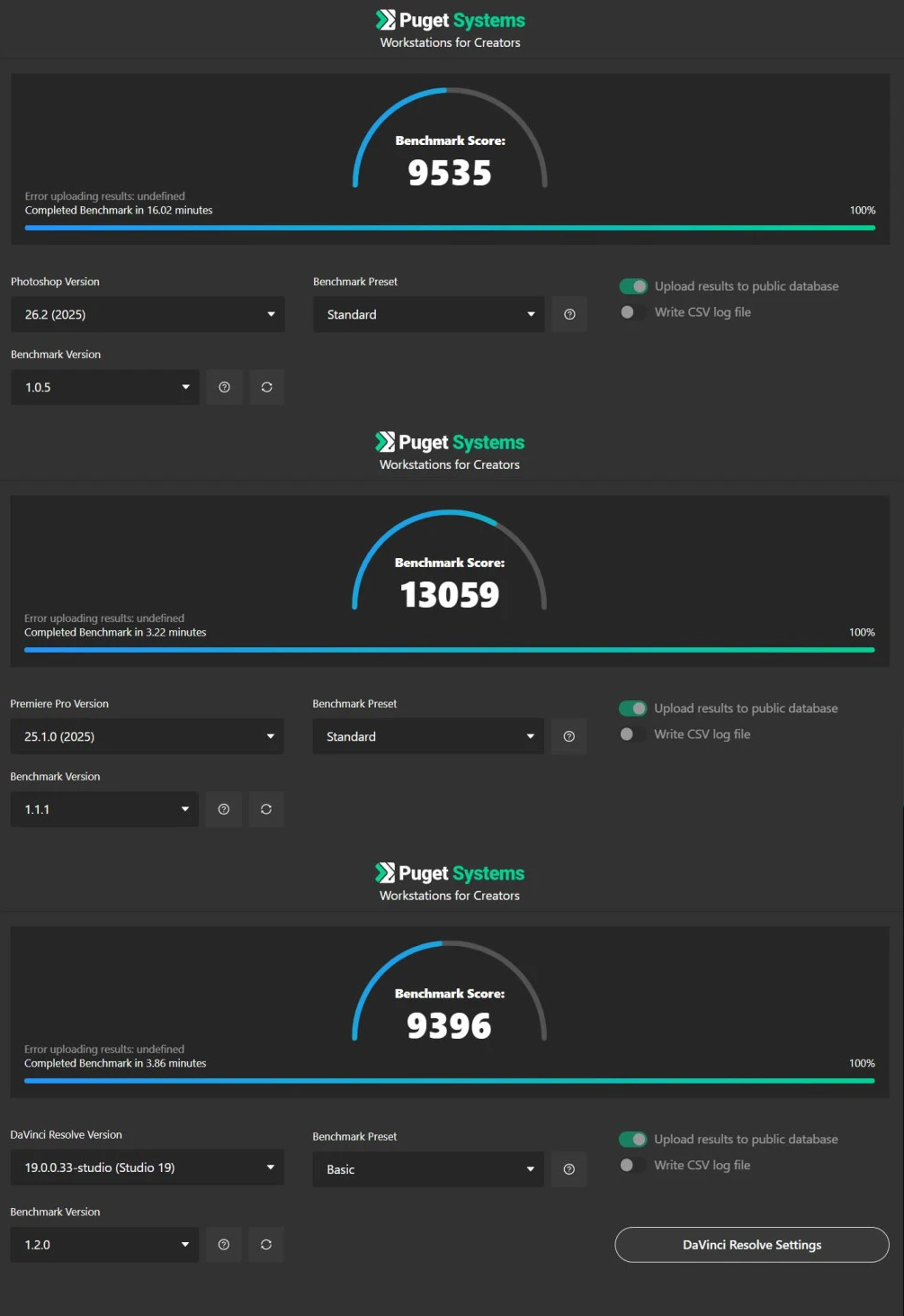 Puget 生产力测试中Ps、Pr、Davinic等工具软件生产力测试得分分别为:9535、13059、9396。