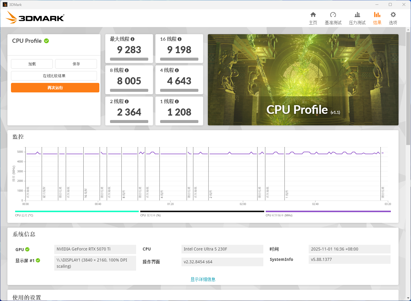 3DMark CPU Profile测试则可以看出CPU在不同线程下的性能表现,最大线程得分9283,16线程得分9198,8线程得分8005,四线程得分4643,2线程得分2364,单线程得分1208。