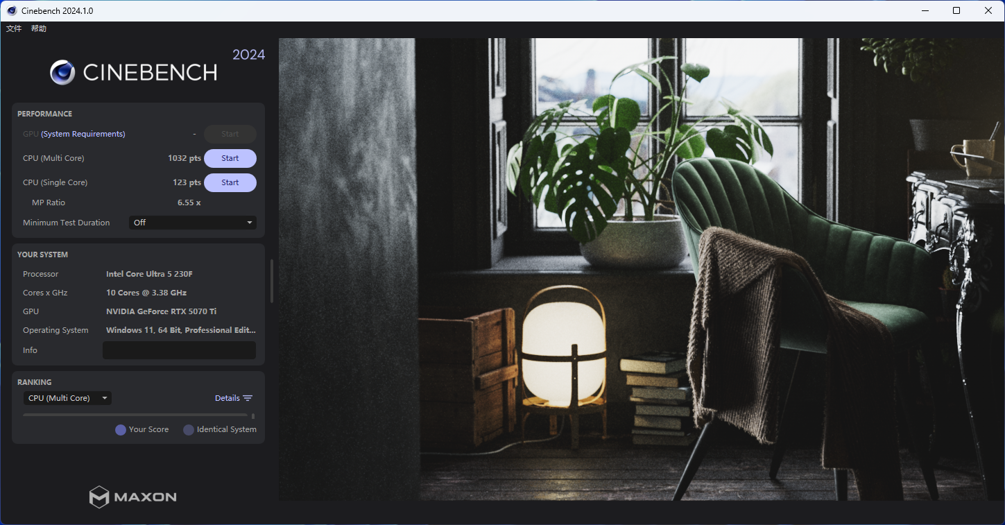 在Cinebench的性能测试中,R23单核得分2047,多核得分17390;2024单核得分123,多核得分1032。