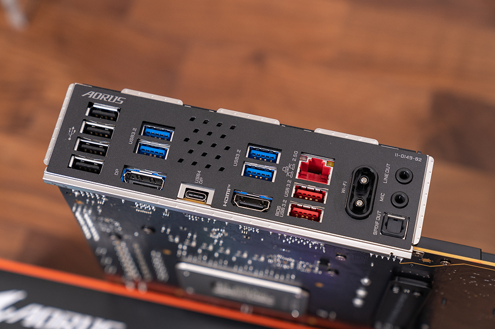 技嘉B860M电竞雕主板采用一体化背板设计,背板上带有通风孔,提供 4 个 USB2.0 A 口、6 个 USB3.2 A 口和 1 个 USB4(40Gbps 速率)Type-C 接口,此外还配有 1 组 HDMI 和 DP 视频输出接口,2.5G 有线网口、WiFi7 天线接口以及 1 组数字音频输出接口。