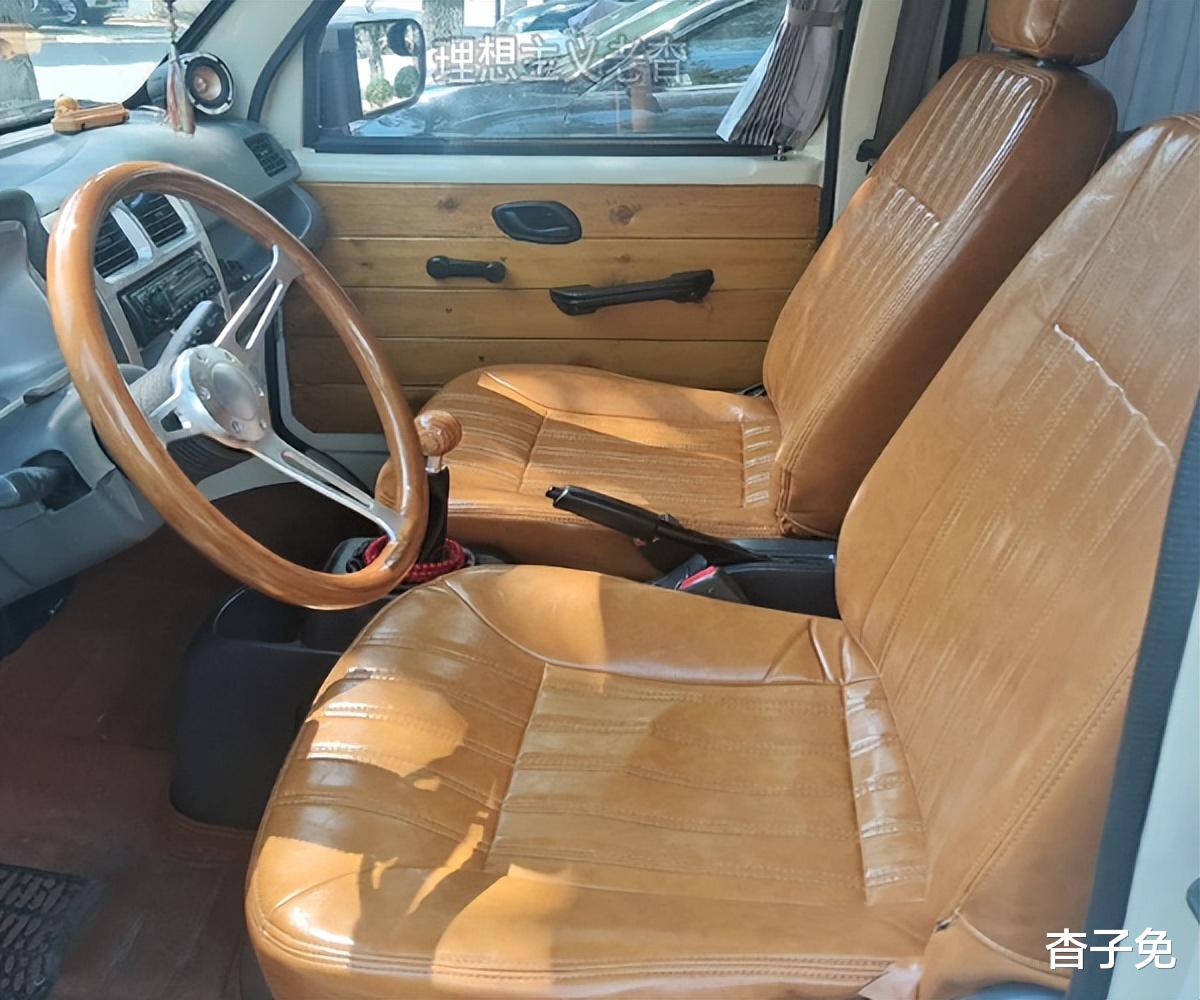 进入驾驶室,内门实木装修,油蜡皮座椅光滑而富有弹性,方向盘及档杆头与座椅颜色保持一致,古色古香的,复古风浓厚。