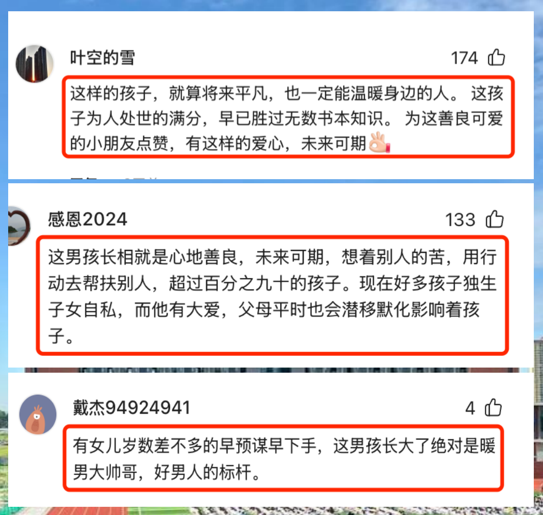 评论区里反复出现的“这样的孩子,就算平凡也能温暖世界”,一位网友说出自己的担忧:“就怕善良的孩子将来被现实伤害”。