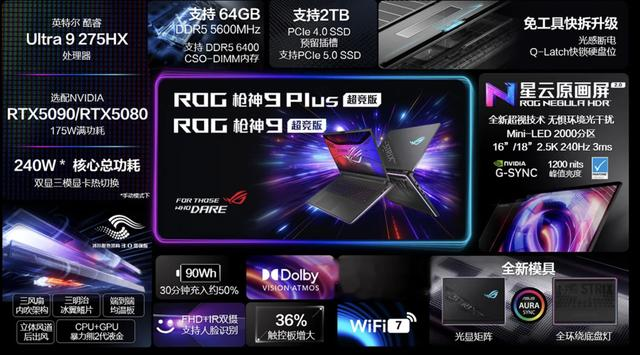 专业游戏党,追求优秀游戏体验:ROG枪神9系列亮点:240W总功耗,最高RTX5080独显、全新超视技术、免工具快拆设计、