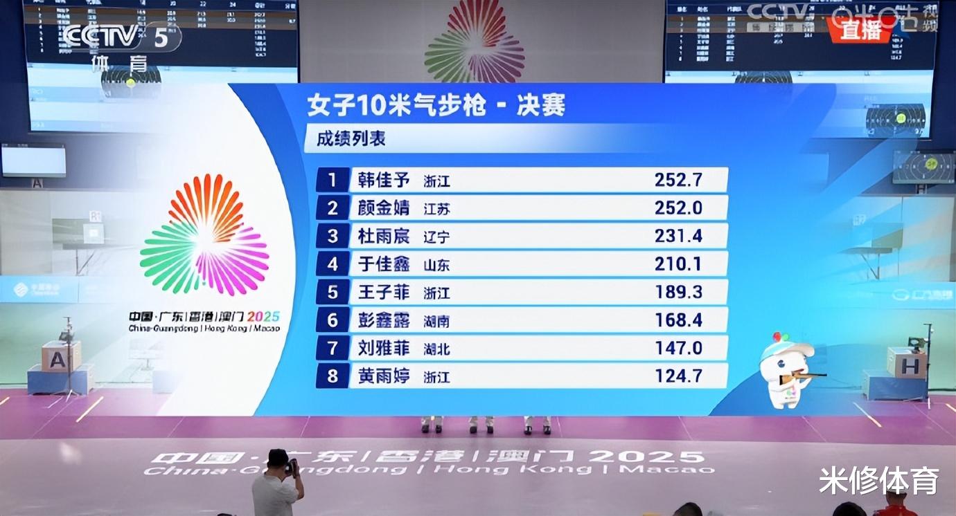 第十五届全国运动会射击步手枪项目10月12日在广州开赛。13日上午和中午进行了女子10米气步枪项目的资格赛和决赛,可谓“神仙打架”,总体水平不逊世界大赛。最终,浙江名将韩佳予以252.7环夺得冠军,巴黎奥运会该项目亚军得主黄雨婷获得决赛第八名。