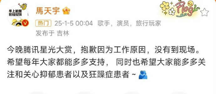 事后,马天宇发微博回应,称让大家“多关心抑郁患者与狂躁症患者”,网友指责马天宇意图阴阳李明德是“狂躁症”,还暗讽近日因为抑郁症频上热搜的赵露思,马天宇随即删除了该微博。随后马天宇又发布声明,称关于“迟到”、“耍大牌”、“不看剧本”等都没有发生过。