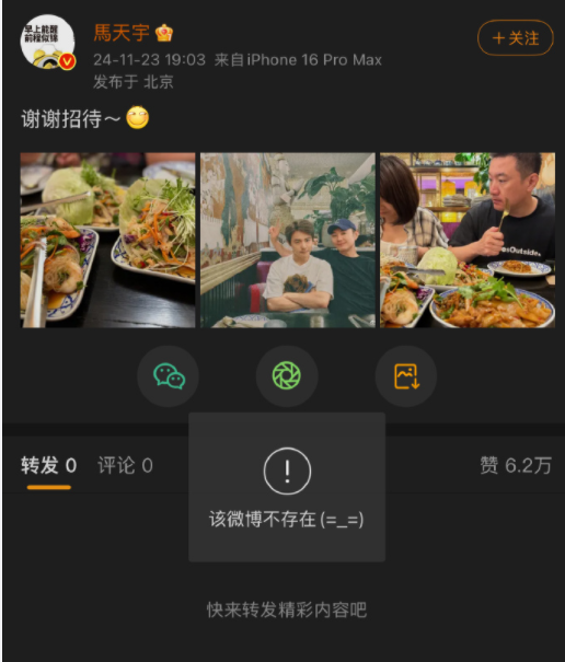 有网友留意到,在《三人行》剧组开机的当天,剧组其他演员的IP都在吉林,而此时马天宇更新微博的IP却在北京,侧面印证了马天宇缺席开机,另外开机后围读剧本一段时间马天宇IP也一直在北京,马天宇随即删除了那几天的微博。