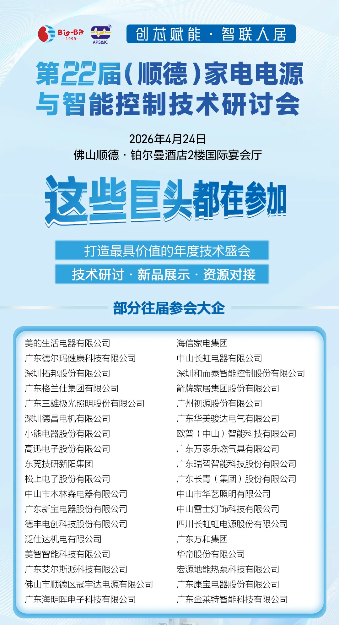 2026年4月24日,由Big-Bit商务网主办,《半导体器件应用网》承办的第22届(顺德)家电电源与智能控制技术研讨会将在广东顺德举行,大会以“创芯赋能 智联人居”为主题,汇聚家电整机技术领袖、创新厂商及产业链精英,通过主题演讲、芯品展示、权威报告及供需对接等环节,直面15kV静电、第三代半导体EMC等核心难题,为产业升级提供支撑。本次研讨会面向家电行业研发、采购及产品管理人员开放,诚邀行业精英齐聚顺德——15kV静电难题的最优解、第三代半导体EMC的核心突破、工程师能力升级的实战干货,都将在4月24日逐一揭晓。4月24日,邀你共赴盛会,共绘“智联人居”的全新未来。