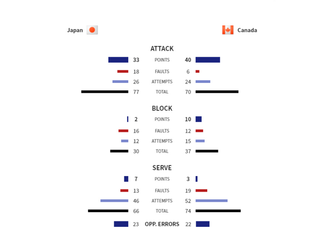 本场比赛,日本队整体表现低迷,攻防两端均被对手压制。主攻手石川祐希状态全无,首局5次扣球无一命中,未能贡献得分。另一核心高桥蓝同样持续表现不佳,进攻效率较低。日本队在拦网环节劣势尤为明显,首局拦网得分以1-6大幅落后。